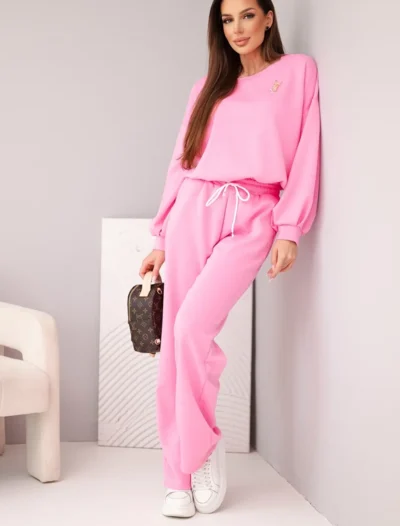 Stiilne ja mugav naistekomplekt, mis on loodud naisele, kes hindab moodi ja mugavust. Lahtine pikkade varrukatega dressipluus, mis on viimistletud elastse ribaga, rõhutab peenelt vöökohta, pakkudes samal ajal liikumisvabadust. Laiad püksid elastse vöökoha ja sirgete jalgadega loovad harmoonilise terviku, mis sobib ideaalselt igapäevaseks kandmiseks, reisimiseks ja isegi elegantseks koduriideks. Meeldiva puudutusega viskoos lisatud elastaaniga pakub pehmust ja istuvust.