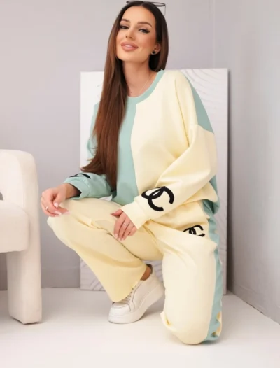 Nautige mugavust ja stiili selle pehme ja võise naiste dressipüksidega! See ainulaadne komplekt võlub oma ebatavalise pastelsete värvide – beeži ja sinise – kombinatsiooniga, luues värske ja naiseliku ilme, mis sobib ideaalselt igapäevaseks kandmiseks. Lahtine ülisuur dressipluus ja sirged püksid elastse vöökohaga pakuvad maksimaalset kandmismugavust. Esiküljel olev tikand lisab sportlikku elegantsi ja ainulaadset aktsenti.