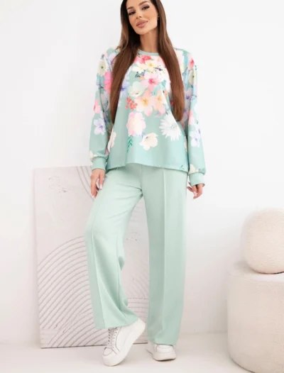 Elegantne naiste viskooskangast komplekt on suurepärane valik naistele, kes hindavad mugavust koos naiseliku stiiliga. Komplekti ülaosas on pilkupüüdev lillemuster, mis annab kogu riietusele värskuse ja peene elegantsi. Ühevärvilised püksid tasakaalustavad stiili ideaalselt, luues harmoonilise ja moodsa komplekti.