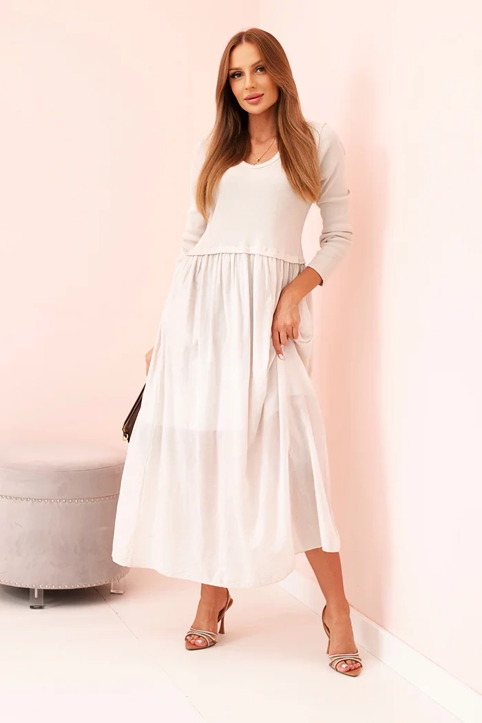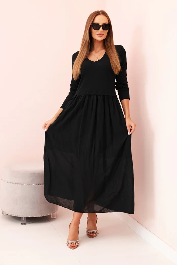 Kerge kleit meeldivast puuvillasest kootud kangast, mis langeb kaunilt siluetti. Ülaosa on soonikkoes materjalist, mis rõhutab naiselikku joont, samas kui kergelt kroogitud alumine osa lisab kergust. Sügav V-kaelus pikendab visuaalselt kaela ja pikad varrukad pakuvad mugavust jahedamatel päevadel.