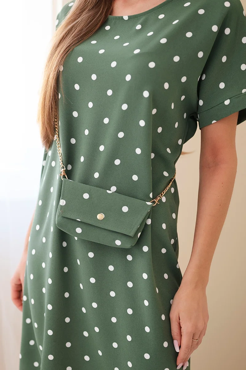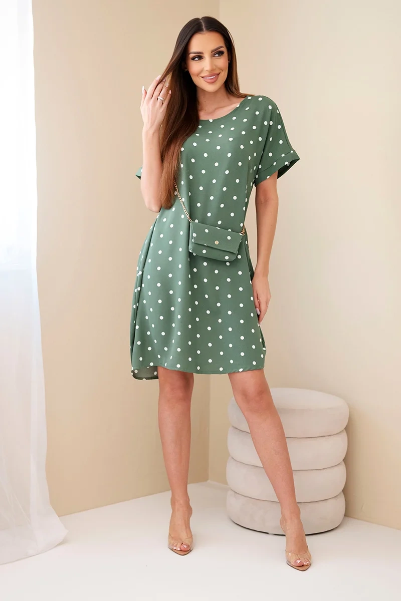 Naiste lühikeste varrukatega täpiline kleit on stiilne ja mugav valik nii igapäevaseks kandmiseks kui ka suvisteks väljasõitudeks. Klassikaline täpiline muster annab sellele ajatu võlu, samas kui lai lõige tagab maksimaalse kandmismugavuse ja liikumisvabaduse. Mudel paistab silma ka praktilise lisandiga väikese ketiga koti näol, mis täiendab ideaalselt üldist riietust.