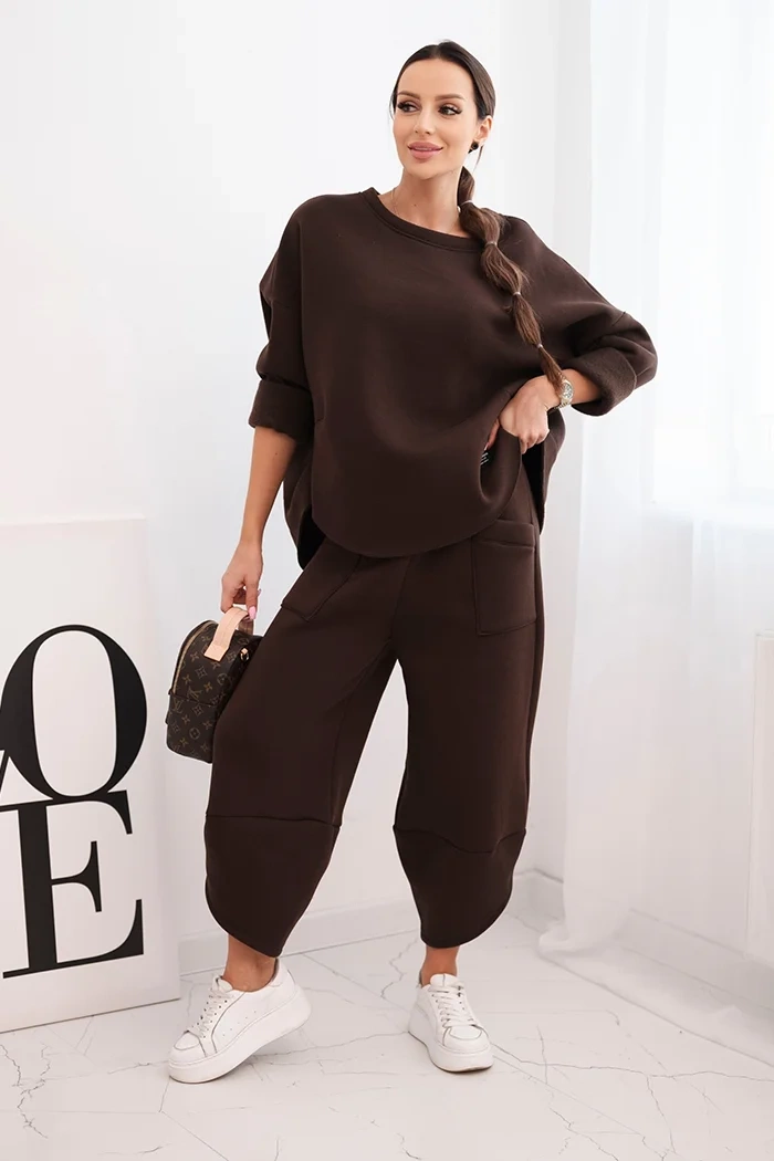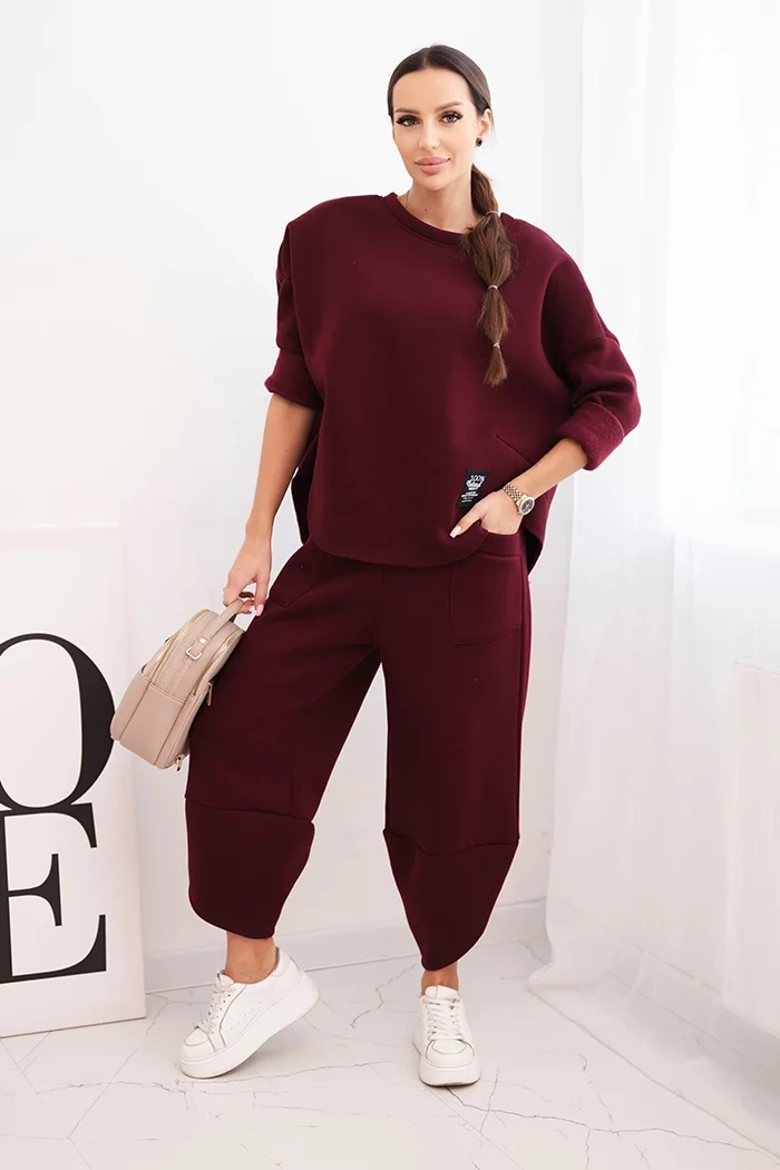 Funktsionaalsus: elastse vöökoha ja taskutega püksid, langetatud õlaga dressipluus