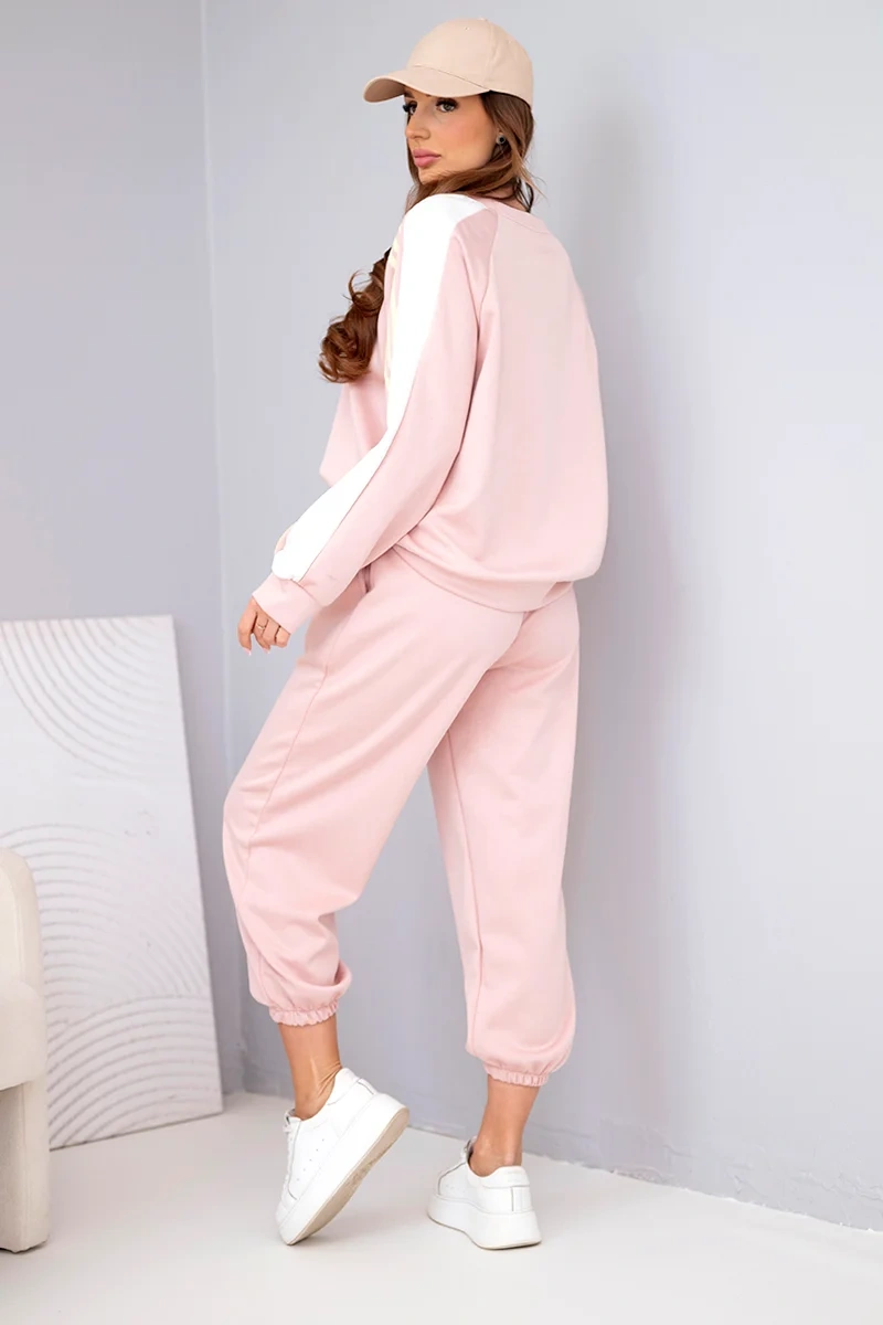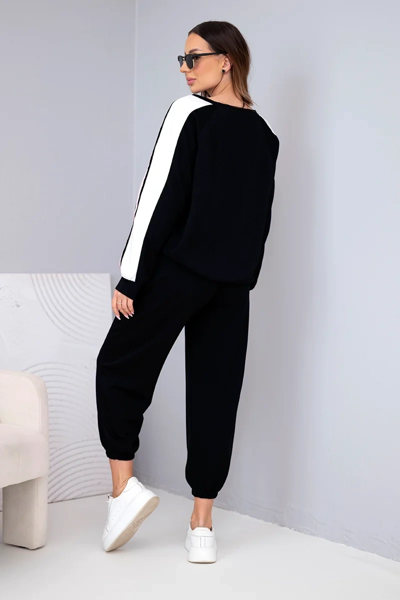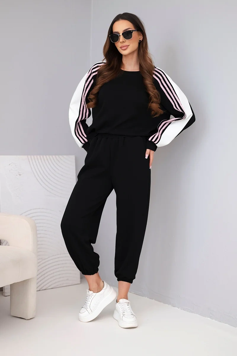 Dressipluusi vabaaja lõige tagab mugava kandmise ning varrukatel olevad dekoratiivsed küljetriibud annavad komplektile sportliku iseloomu. Pükstel on elastne vöökoht ja kätised pahkluude juures, seega sobivad need ideaalselt figuuriga. Pehme, võine materjal on meeldiv puudutusele ja veniv, tagades mugavuse terveks päevaks.