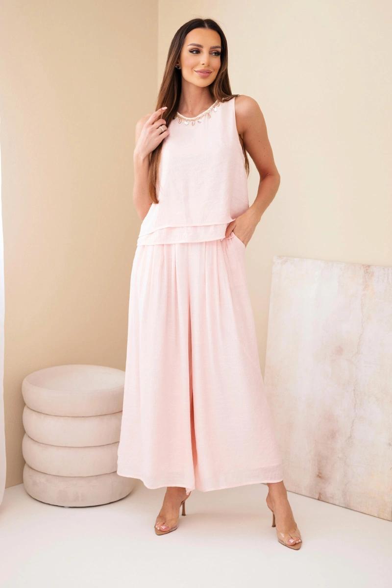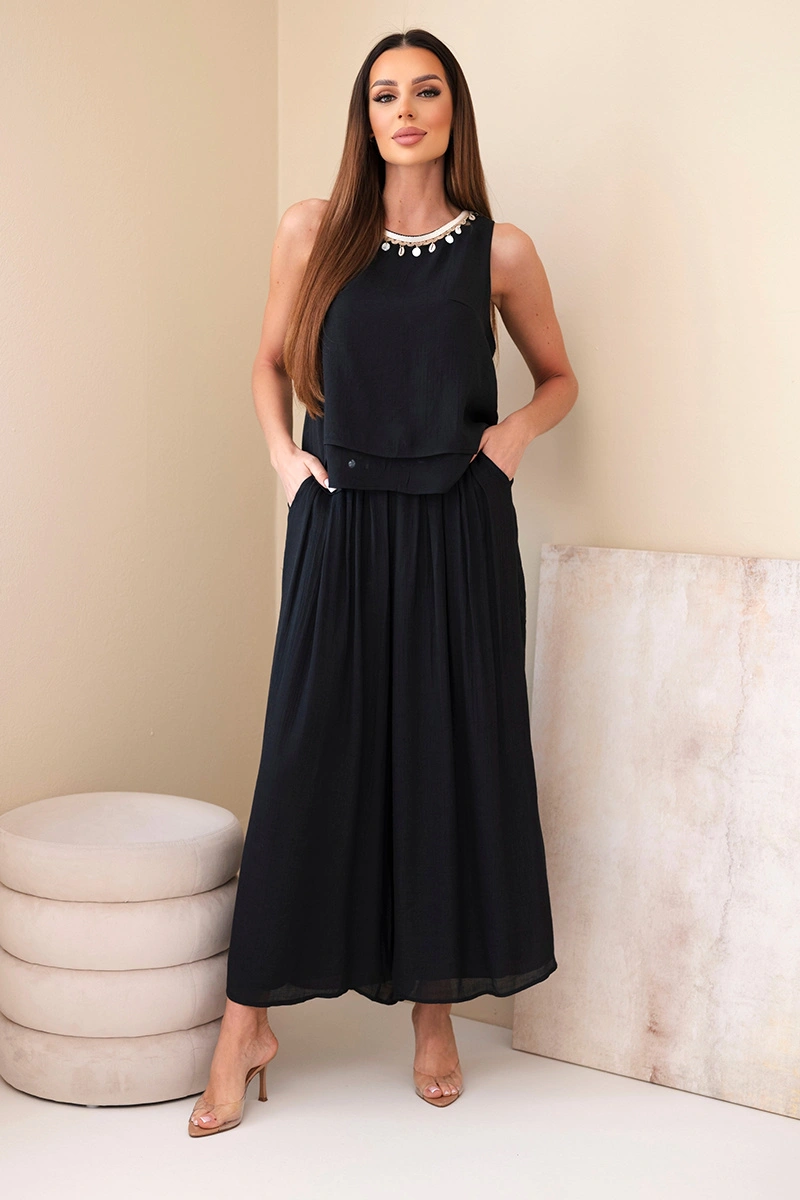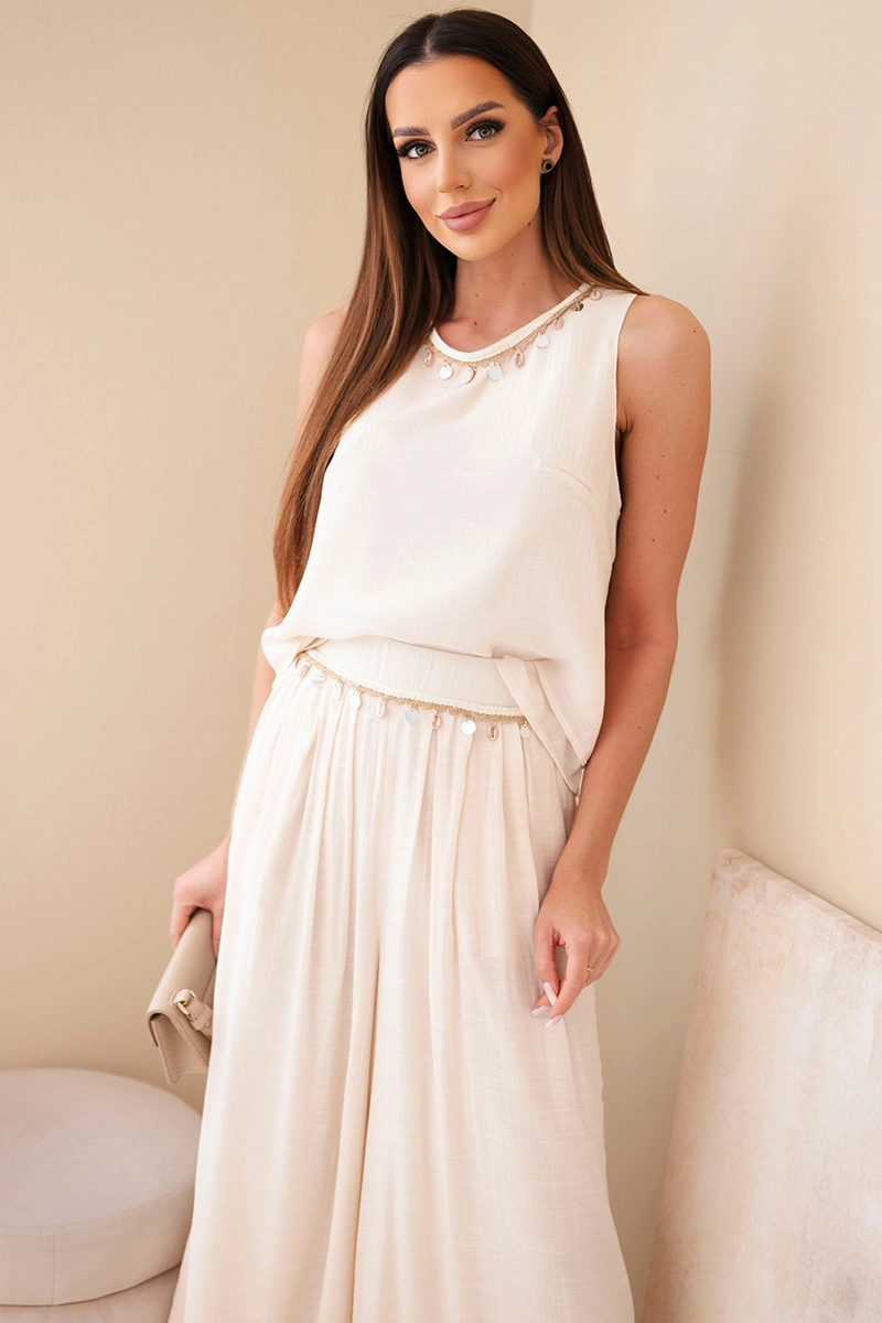 Elegantne ja äärmiselt mugav naistekomplekt on suurepärane valik naistele, kes hindavad stiili ja kandmismugavust. Komplekt koosneb kergest varrukateta topist ja laiadest pükstest, mis koos loovad moodsa ja harmoonilise riietuse. Peened dekoratiivsed detailid dekolteel ja pükste vöökohal koos dekoratiivelementidega lisavad tervikule ainulaadse iseloomu ja õrna elegantsi.