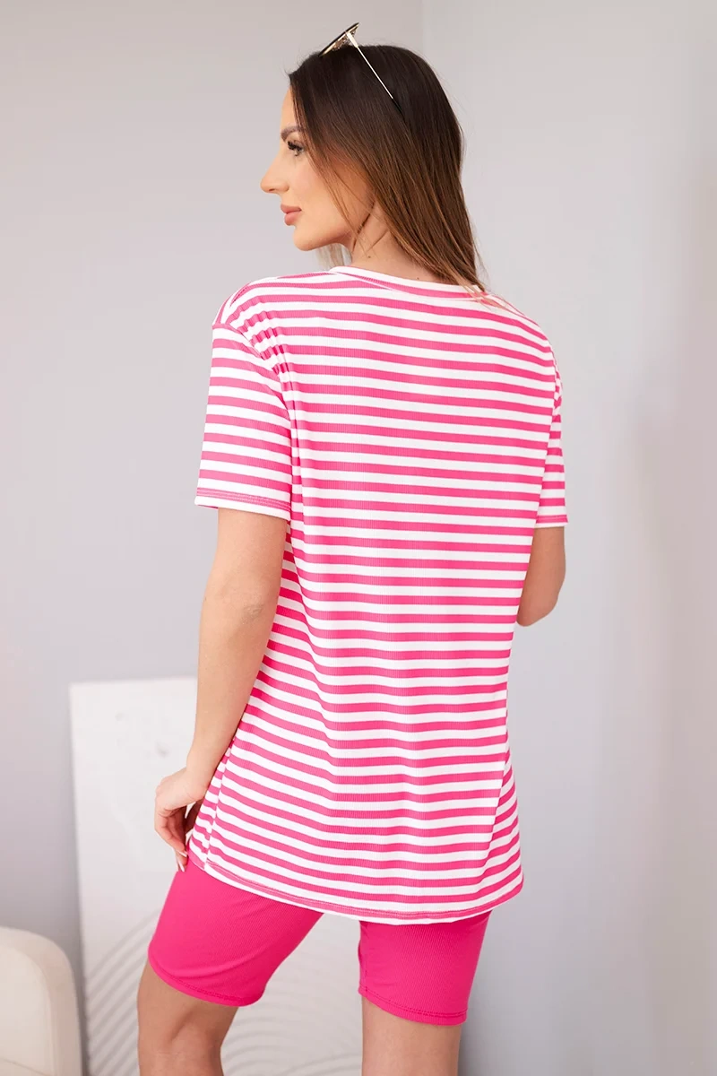 Naiste triibuline komplekt lühikeste varrukatega topist ja lühikestest pükstest on mugav ja stiilne valik soojemateks ilmadeks. Komplekt koosneb vabamast lühikeste varrukatega topist ja liibuvatest lühikestest pükstest, muutes kogu välimuse moodsaks ja väga naiselikuks. See on ideaalne valik igapäevaseks kandmiseks, jalutuskäikudeks, puhkusereisideks ja mugavas versioonis ka kodus kandmiseks. Klassikalise triibulise mustri ja tavaliste lühikeste pükste kombinatsioon muudab komplekti moodsaks ja mitmekülgseks.