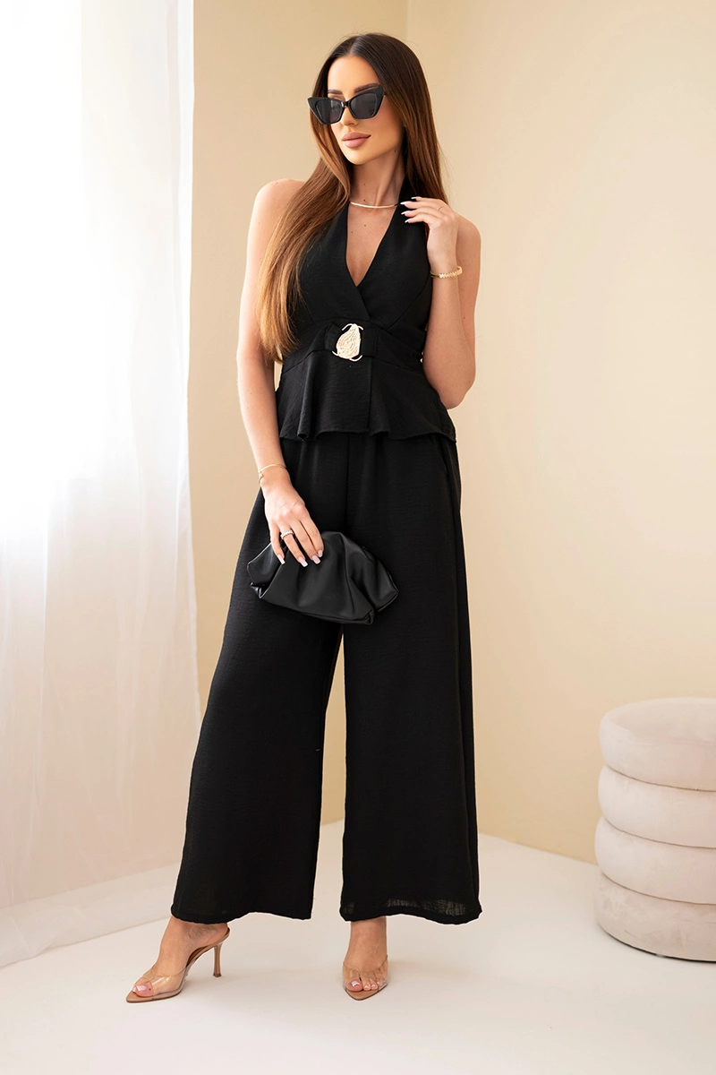 Elegantne ja stiilne naistekomplekt on ideaalne valik naistele, kes hindavad moodsaid, kuid mugavaid lahendusi. Komplekt koosneb pilkupüüdvast topist ja laiadest pükstest, mis koos loovad tervikliku ja väga naiseliku riietuse. Topil on sügav dekoltee ja kaelal pael, mis rõhutab kaunilt siluetti ja lisab sensuaalset iseloomu. Lisaväärtuseks on dekoratiivne pannal vöökohal, mis vormib figuuri ja köidab tähelepanu.