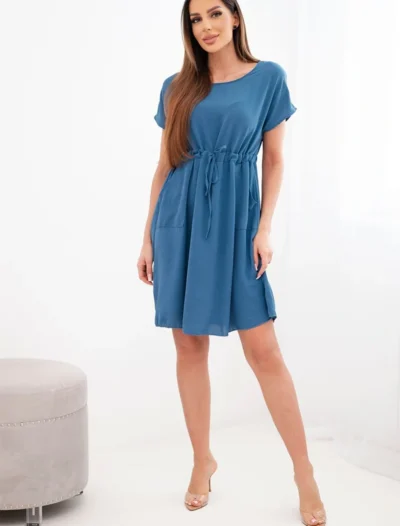 Lühikeste varrukatega ja vöökohal paeltega naistekleit on suurepärane valik naistele, kes hindavad mugavust ja moekat, pingevaba stiili. Laiem lõige pakub kandmismugavust ning reguleeritav vöökohal pael võimaldab teil kleiti oma figuuriga kohandada, seda peenelt rõhutades.