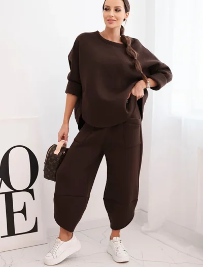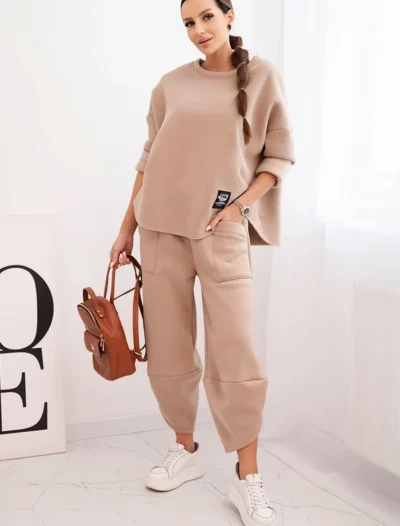 Funktsionaalsus: elastse vöökoha ja taskutega püksid, langetatud õlaga dressipluus